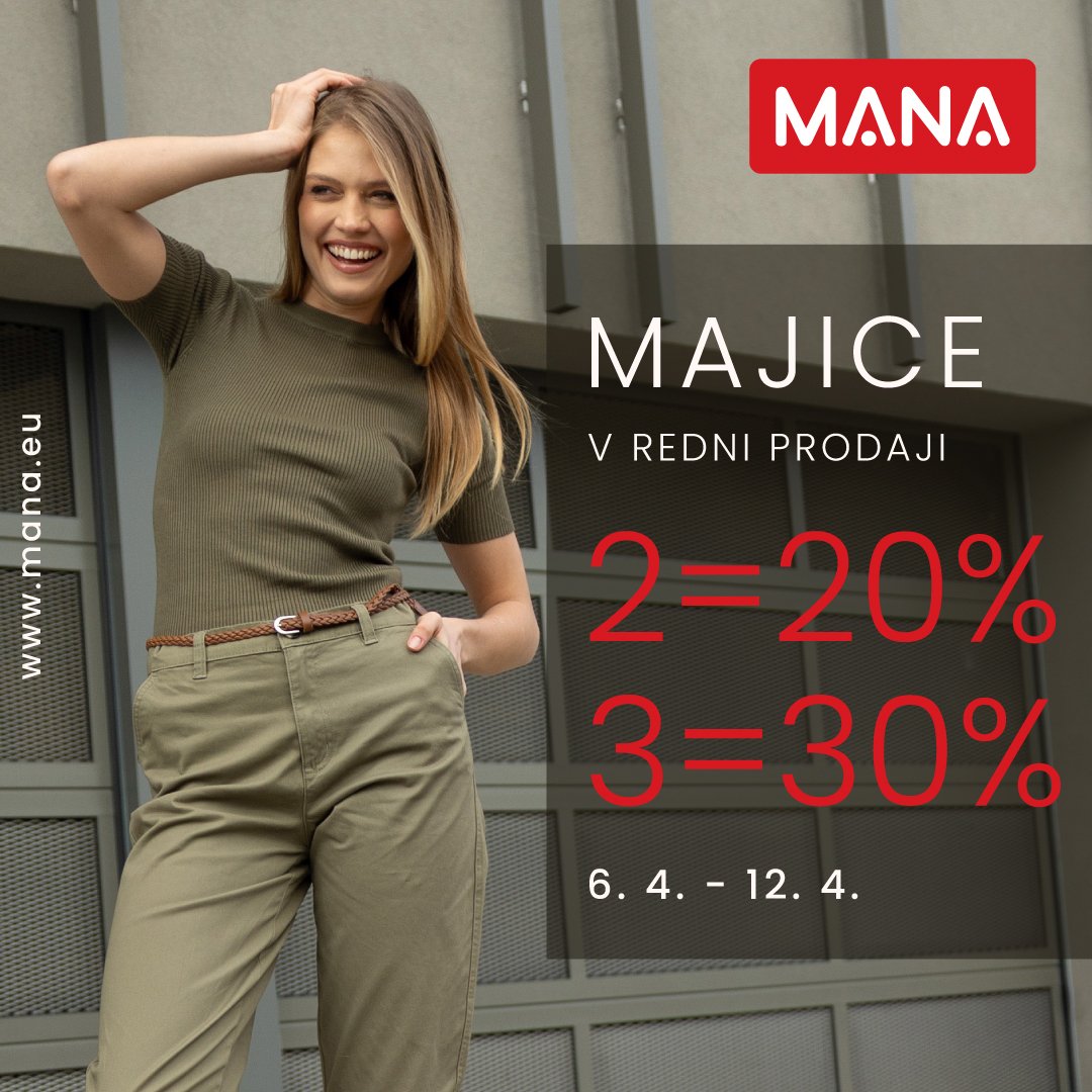 V trgovinah MANA te čaka akcija na majice za vso družino! Kupi 2 in prihrani 20 %, kupi 3 in prihrani 30 %. Izbiraj med majicami za vse generacije,…